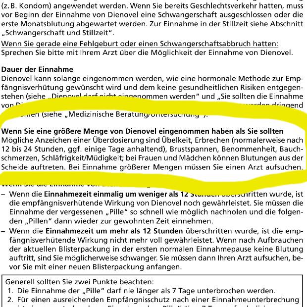 Bei einer länger als 7 tage dauernden pause steigt außerdem das thromboserisiko bei erneuter pilleneinnahme zunächst an.